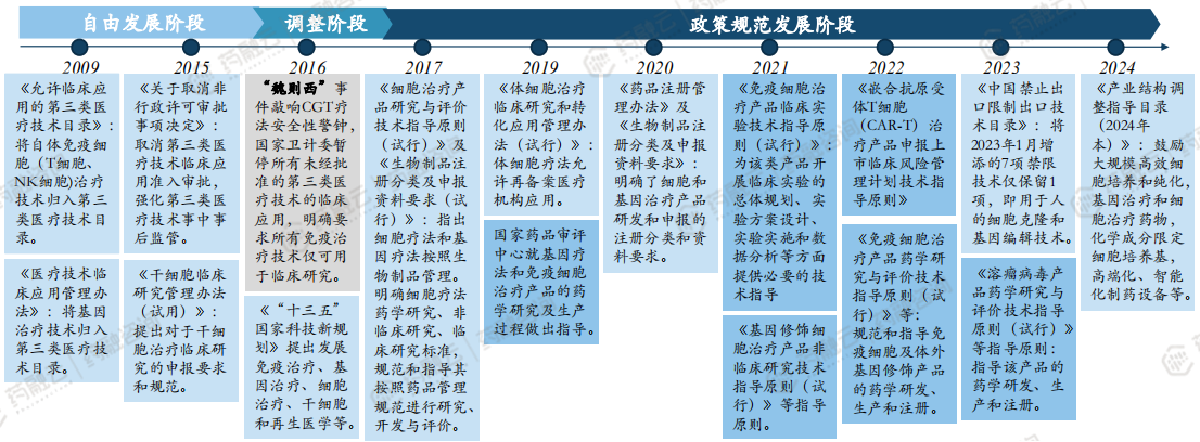 我国CGT政策历经自由发展、调整、规范三个发展阶段:自由发展阶段监管政策法规相对滞后,内容相对简单,对CGT研究开发的多个环节所涉及的具体问题没有详细说明和规定,法规约束性不强,审批相对宽松。2016年“魏则西”事件敲响了CGT疗法安全性的警钟,中国开始加强生物安全、基因技术和生物医学等领域的立法。近年来对于细胞与基因治疗的规划来看,主要以加速新药研发、开展生物技术创新等支持性规划为主。监管体系和评价方法也在不断完善,以适应技术进步和产业发展的需求。