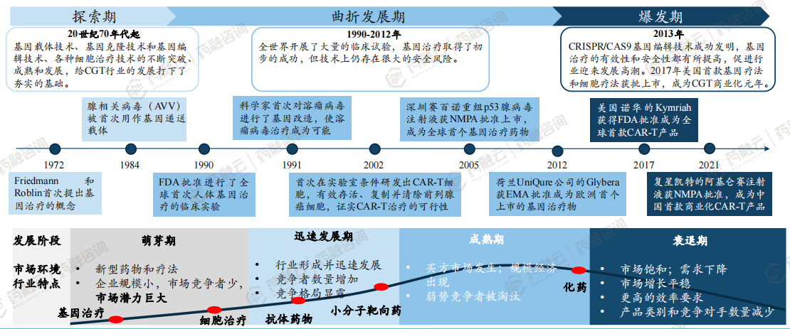 CGT经历50多年的发展,相比化药、靶向药,仍处于萌芽期。从CGT自身的发展历程来看,它经历了探索期、曲折发展期和爆发期,但是跟化药和大分子小分子靶向药相比,它仍处于萌芽期。