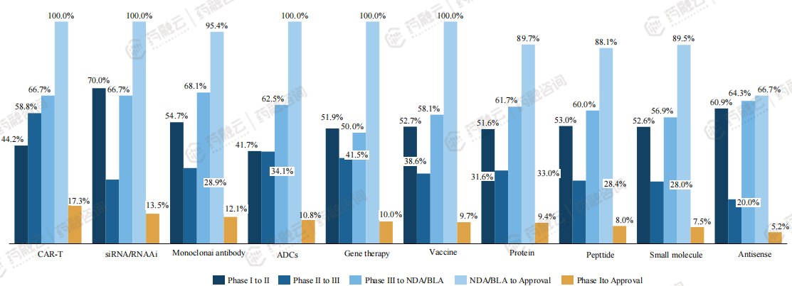 虽然CAR-T和RNAi复杂性增加了,但是药物作用的靶点更加清晰,作用机制更加明确,由此药物的LOA也大大提高。