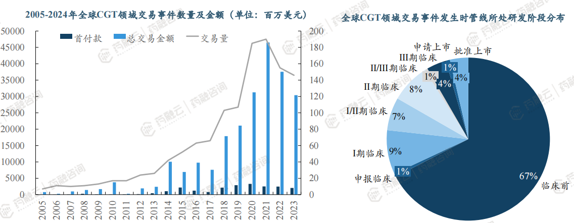 1. CGT领域交易2020-2022年活跃度较高,67%为临床前阶段