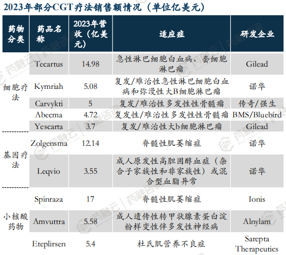 从2023年部分CGT疗法销售额情况来看,10款CGT疗法大卖77亿美元,Tecartus、Zolgensma、Spinraza均突破10亿美元。