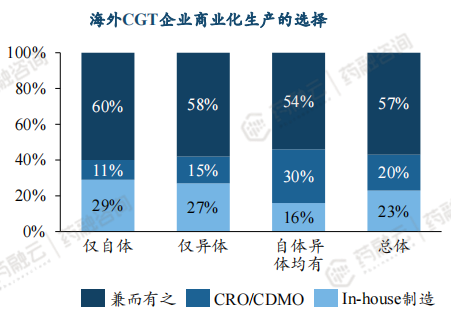数据显示77%的CGT企业与CDMO公司有合作,其中20%选择将生产流程完全外包,57%选择兼有CDMO供应和自主制造,而仅有23%的企业完全自主制造。分自体疗法与异体疗法看,异体疗法公司选择CDMO的比例高于自体(73%vs71%),而若该企业同时拥有自体和异体疗法的业务则84%的企业将选择使用CDMO服务。可见海外CGT制造领域已拥有较高外包渗透率。