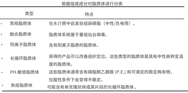 脂质体分类标准众多,包括结构特征、结构参数和尺寸、合成方法、组成成分和载药量等。根据组成成分对脂质体进行分类,可以分为常规脂质体、融合脂质体、阳离子脂质体、长循环脂质体、PH.敏感脂质体、免疫脂质体。