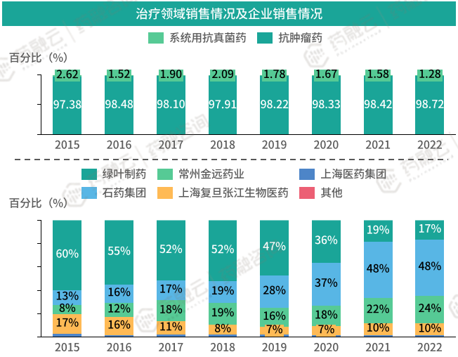 作为抗癌大品种,盐酸多柔比星脂质体注射液医院市场的销售额常年保持两位数增长,2021年销售额更是超过50亿元。据药融云全国医院销售(全终端)数据库显示,2022年全国医院终端市场盐酸多柔比星脂质体注射液的销售额为47.66亿元,其中石药欧意占据58.29%的市场份额,其次是金远药业占据13.96%。