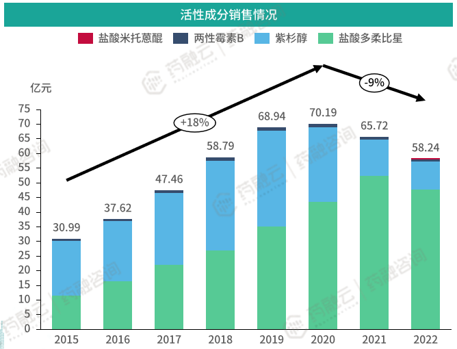 据药融云数据库统计,截至2022年,有相关销售信息的活性物质共有4个,分别为盐酸多柔比星、盐酸米托蒽醌、两性霉素B及紫杉醇。2015-2020年间,我国脂质体市场保持快速增长,2020年销售规模峰值达到70.19亿元,年复合增长率为18%;2020年后销售额逐年降低。