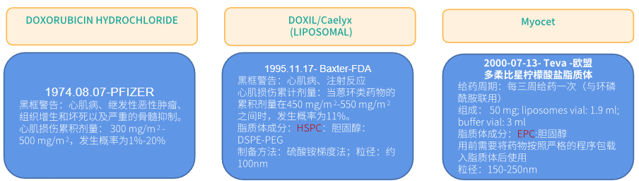 2. 已上市脂质体:DOXIL/Caelyx(长循环)、Myocet(非PEG化)、Lipo-dox