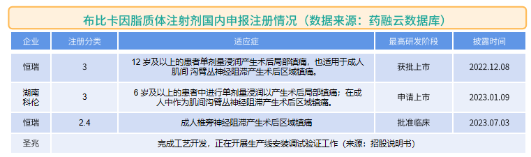 药融云数据库显示,恒瑞制药在2020年11月启动了布比卡因脂质体的生物等效性研究,对照药是Exparel,2021年4月提交了3类仿制上市申请,目前已获批。科伦药业的此类产品也在BE试验中。