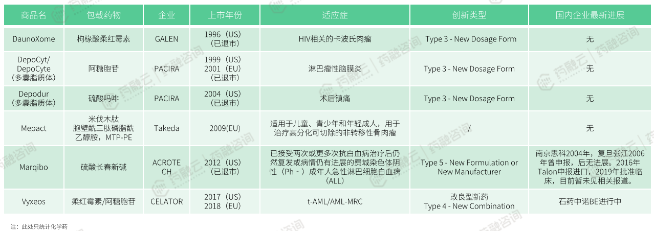 目前,在国外上市未在国内注册上市的脂质体药物,有枸椽酸柔红霉素(商品名:DaunoXome)、阿糖胞苷(DepoCyt/DepoCyte)、硫酸吗啡(Depodur)、米伐木肽(Mepact)、硫酸长春新碱(Marqibo)、柔红霉素/阿糖胞苷(Vyxeos)等。