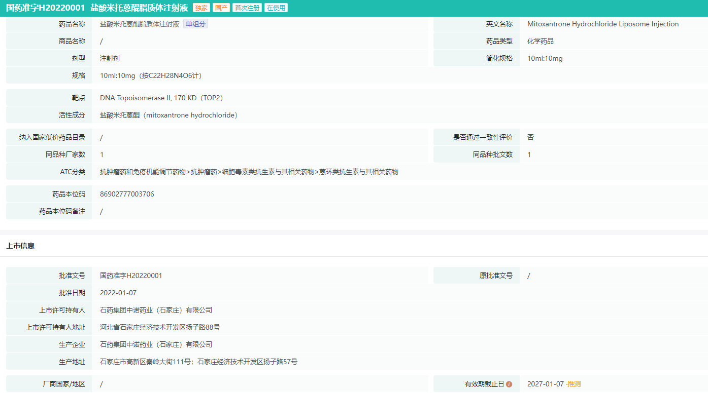 盐酸米托蒽醌脂质体注射液药品批文信息