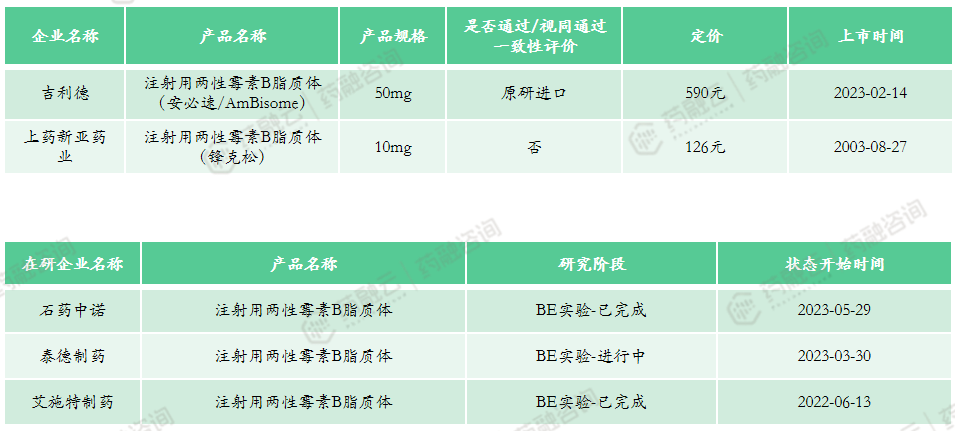 国内最早上市的注射用两性霉素B脂质体是上海上药新亚药业的锋克松,于2003年上市。2023年2月,国家药品监督管理局批准了原研企业吉利德的两性霉素B脂质体上市(商品名:安必速)。
