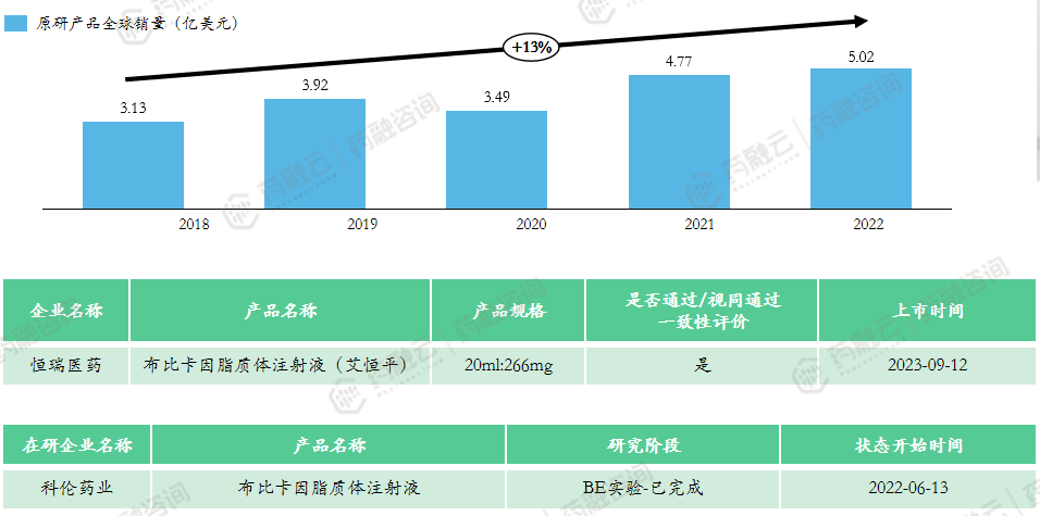 恒瑞制药在2020年11月启动了布比卡因脂质体的生物等效性研究,对照药是Exparel,2021年4月提交了3类仿制上市申请,目前已获批。目前科伦药业的此类产品也在BE试验中。