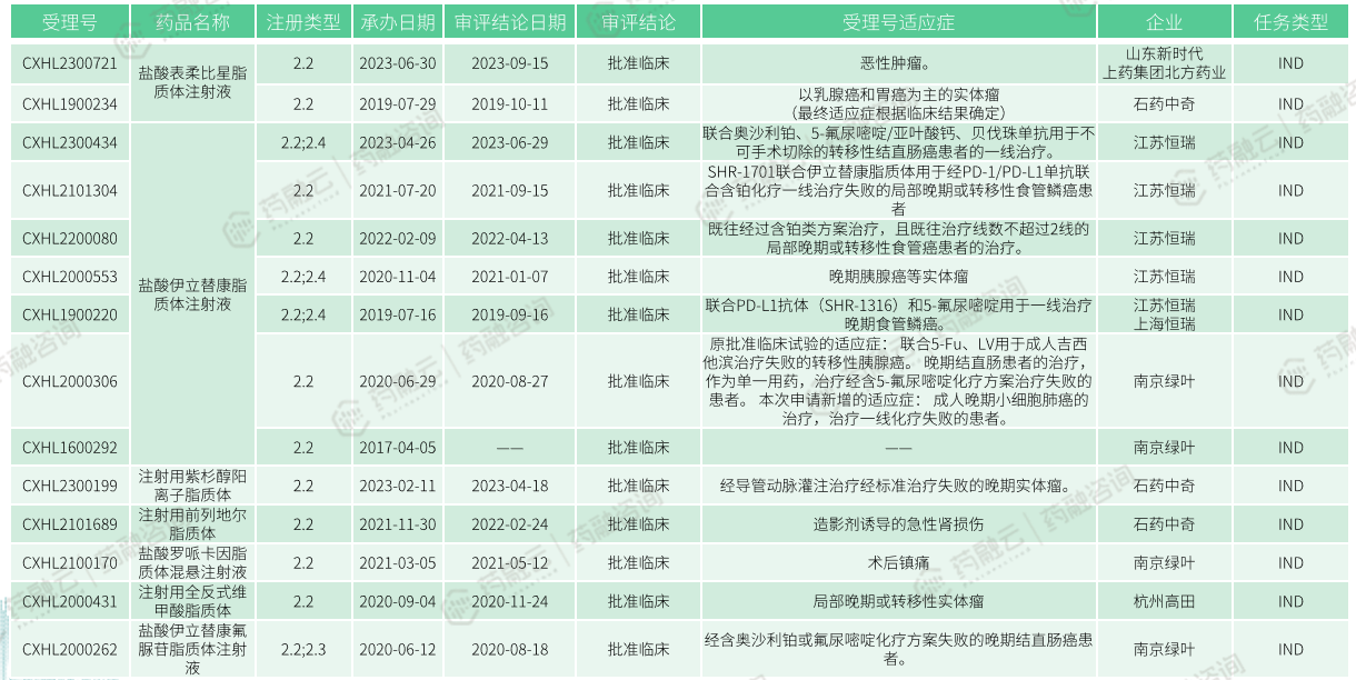 药融云数据库显示,目前国内在研的改良型脂质体注射剂产品有:盐酸表柔比星脂质体注射液、盐酸伊立替康脂质体注射液、注射用紫杉醇阳离子脂质体、注射用前列地尔脂质体、盐酸罗哌卡因脂质体混悬注射液、注射用全反式维甲酸脂质体、盐酸伊立替康氟脲苷脂质体注射液等,涉及恒瑞医药、石药集团、绿叶制药等企业。