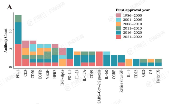 有文献对历年来获批以及在临床/临床前开发阶段的抗体疗法的治疗靶点进行了统计分析。目前160多种已批准的抗体疗法中涉及90多个靶点,从统计结果来看,CD3靶点已被广泛研究,获批药物数量仅次于PD-1,在全球研发热度较高。