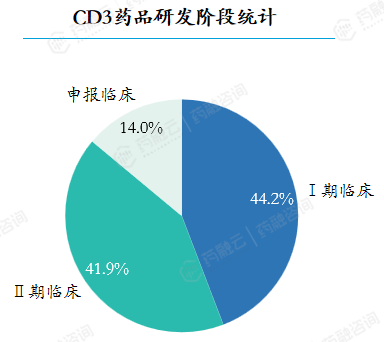 在2018-2023年期间,共计受理CD3药品43个。国内CD3新药研发进度较为滞后,受理的43个CD3药品中最高研发阶段为II期临床,I期临床和II期临床阶段的药品数基本持平,分别占比44.2%和41.9%。