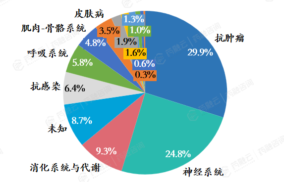 其次是神经系统领域,占比24.8%,反映了神经性疾病在中国的高发病率和迫切的治疗需求。在神经系统疾病领域,常见的疾病包括急慢性疼痛、中风、帕金森病、阿尔茨海默病、自闭症、精神分裂症等。