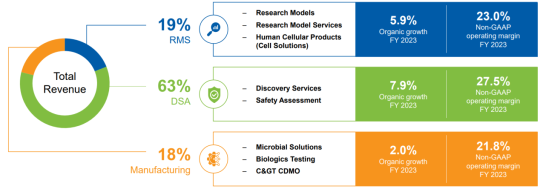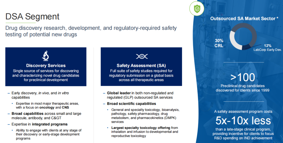 药物发现和安全性评价(DSA)部门由两部分业务组成:药物发现服务和安全性评价,以支持潜在新药的研究、开发和法规要求的安全性检测,包括治疗性药物的发现和优化、体外和体内研究、实验室支持服务,以及战略性非临床咨询和项目管理,以支持产品开发。DSA业务占Charles River总收入的63%。
