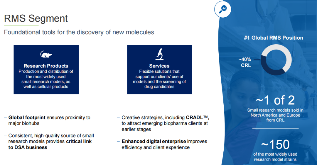 根据企业公开信息,RMS业务占公司总收入的19%,根据管理估计和公开市场信息,Charles River的RMS业务约占全球市场的40%,居于全球首位。RMS业务可提供约150种使用最为广泛的研究模型品系;在北美和欧洲销售的用于临床前研究的小型研究模型有大约二分之一来自于Charles River。