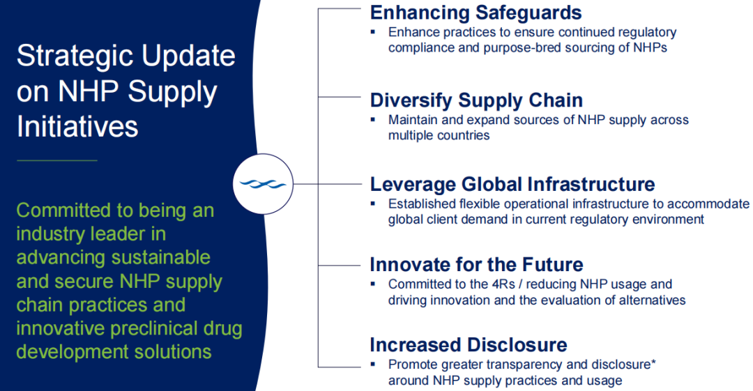 加强对NHP供应链的保障措施:Charles River采用广泛、多层次的审计方法,包括更频繁的供应商审计/访问,在某些供应商进行基因检测以确认亲子关系,以及加强审计程序;增强数字记录保存;改进供应商的尽职调查和培训计划;与学术机构合作,开发了一个基因检测平台,确认NHP的目标繁殖状态,已在毛里求斯的NHP供应商进行验证和试点,计划在某些供应商实施基于风险的基因检测方法;与国家监管机构和政府当局密切合作,继续按照适用的法律和法规行事。