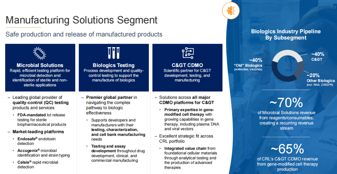 根据企业官方信息,Charles River是全球领先的质量控制(QC)测试产品和服务提供商,可提供FDA授权的无菌生物制药产品的批量释放测试,拥有市场领先的平台,如Endosafe®内毒素检测、Accugenix®微生物鉴定和菌株分型、Celsis®快速微生物检测;在制造领域提供跨所有主要的C> CDMO平台的解决方案。Charles River约70%的微生物解决方案收入来自试剂/消耗品,创造了一个经常性收入。另外,该公司C> CDMO收入的65%来自基因修饰细胞治疗产品生产。该部分业务开展了1000项研究,支持了20项FDA批准的C>疗法。