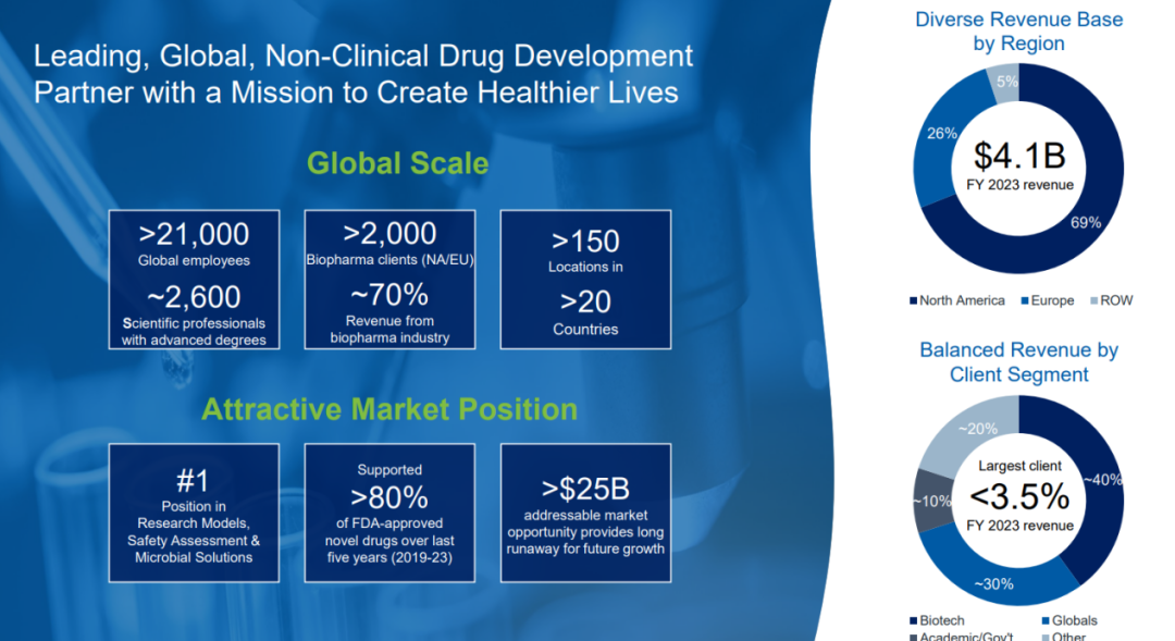 2023年度,Charles River年收入首次超过40亿美元,全球员工达到了约21800名,生物制药客户超过4000家,包括100家大型制药公司。2023年,85%的FDA批准的药物和80%的罕见病和孤儿病药物都有Charles River参与的身影。作为全球知名的非临床CRO巨头,Charles River的研究模型、药物安全性评价和微生物解决方案处于市场领先地位。
