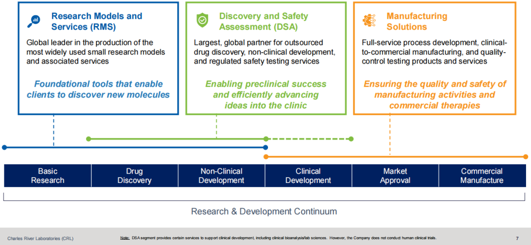 Charles River的服务覆盖了药物研究与开发过程中除了人类临床试验以外的全部环节:基础研究、药物发现、临床前试验、临床开发、制造与商业化,主要业务包括三个方面:研究模型和服务(RMS)、药物发现和安全性评价(DSA),以及制造解决方案。