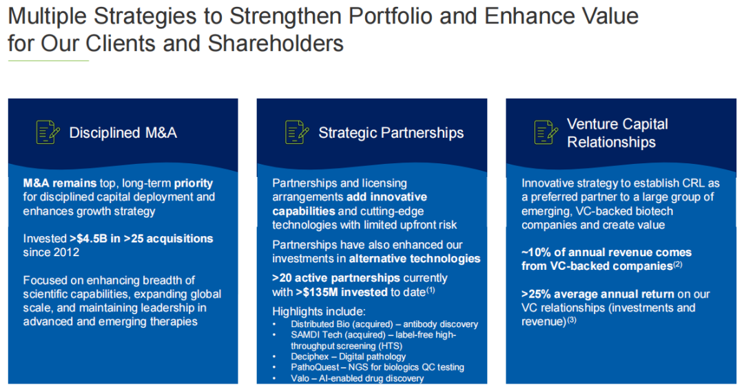 Charles River通过收购、技术合作伙伴关系和内部开发进行投资,以获得创新技术和专业知识。自2012年以来,该公司投资了超过45亿美元收购了超过25家公司。这些投资的重点是提高公司科学能力的广度,扩大全球规模,并保持在先进和新兴疗法方面的领导地位。