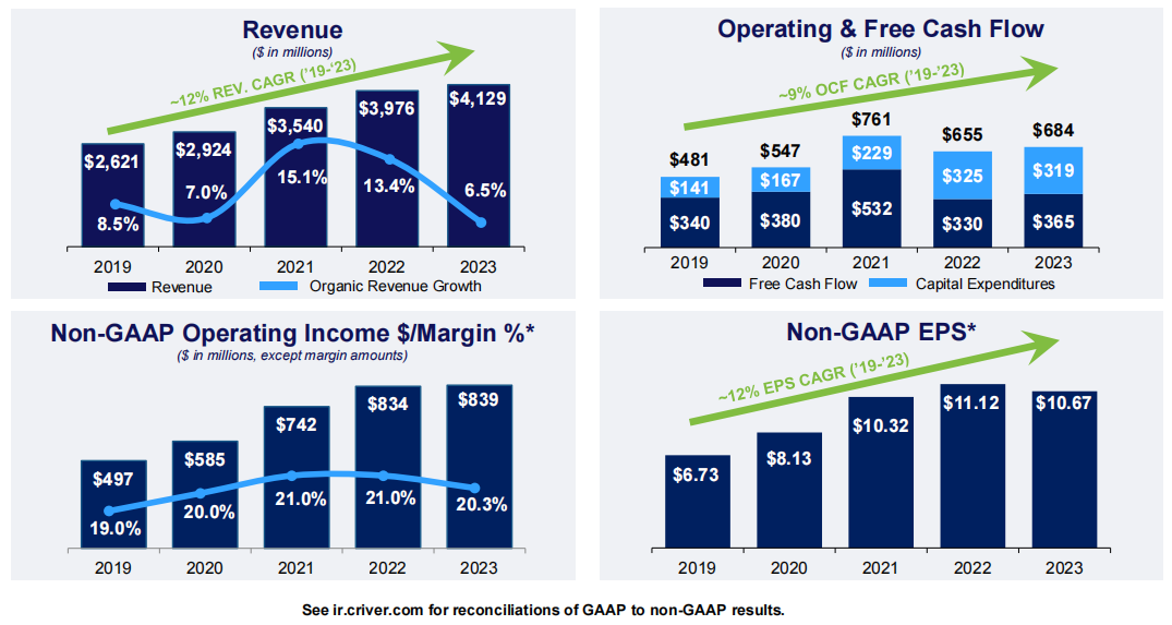 2023全年,Charles River总收入达41.3亿美元,同比增长3.9%;GAAP营业利润率为14.9%,2022年为16.4%;按照GAAP计算,2023年归属于普通股股东的净利润为4.746亿美元,同比减少2.4%;每股摊薄收益为9.22美元,同比下降2.7%。