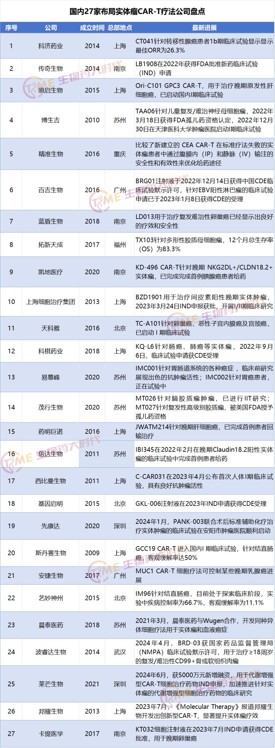 如今,我国已有超25款CAR-T产品处于研发阶段,多家领军企业如传奇生物、科济药业、药明巨诺等积极布局新一代CAR-T及异体CAR-T技术。据不完全统计,国内已有27家公司布局实体瘤CAR-T疗法。