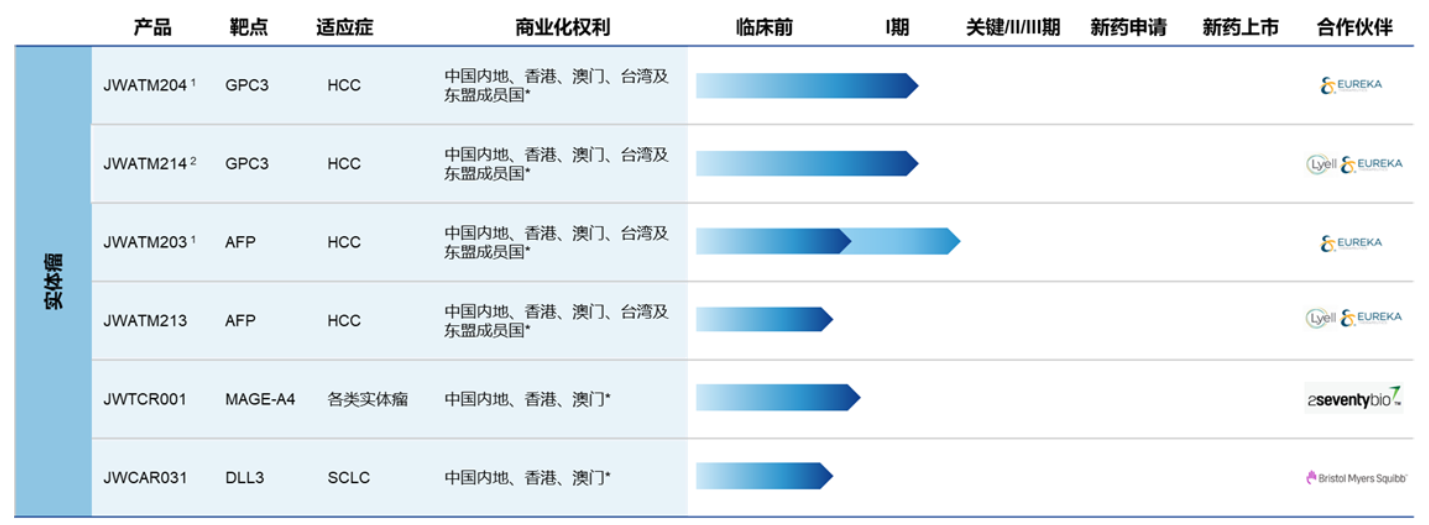 JWATM204适应症为晚期肝细胞癌,2022年7月4日,JWATM204启动I期临床研究。初步临床前研究结果表明,JWATM204在肝细胞癌治疗方面表现出良好的临床开发潜力,表现出GPC3单克隆抗体的高亲和力和高特异性的同时,还拥有更好的安全性。JWATM214用于治疗晚期肝细胞癌,2023年2月28日启动临床研究,且完成了首例患者的回输治疗。