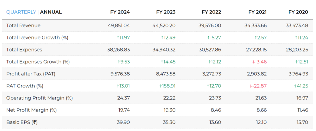2024财年合并业绩显示,公司总收入4985.1亿卢比(59.8亿美元),同比增长11.97%,税后利润(PAT)957.6亿卢比(11.5亿美元),同比增长13.01%。