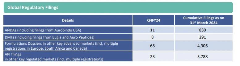 截至2024年3月31日,公司累计向美国FDA提交了830项ANDA,并获得了658项最终批准和27项暂定批准;其中Q4新提交了11项ANDA,有17项ANDA获得最终批准,其中包括4种特殊产品和注射产品。