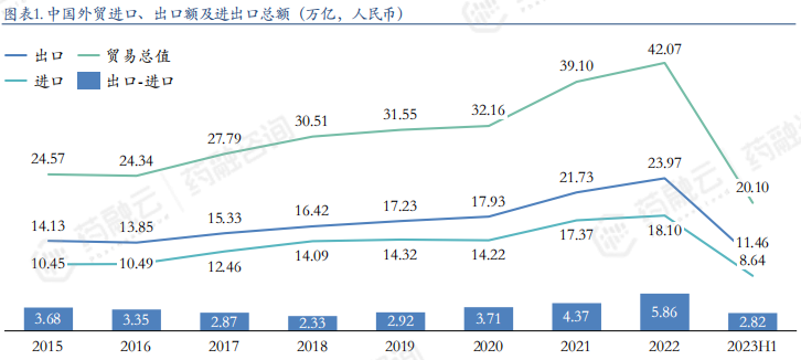 近8年来,中国药品进出口贸易总值呈现出持续增长的趋势,2022年达3600亿人民币。据海关统计数据显示,2015至2022年我国外贸进出口总值持续增长,复合增长率为8%。2022年我国外贸进出口总值为42.07万亿元,比2021年同步增长7.7%。其中出口23.97万亿元,增长10.5%;进口18.1亿元,增长4.3%,进出口相抵,贸易顺差5.86万亿元。