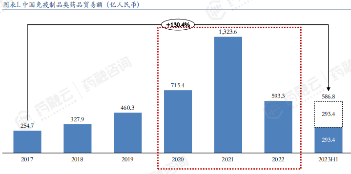 免疫制品在海关编码中包含的单克隆抗体、抗体片段及抗体偶联物,也包含白介素干扰素(IFN)、趋化因子及特定的肿瘤坏死因子(TNF)、生长因子(GF)、促红细胞生成素及集落刺激因子(CSF)等蛋白药物。(此处免疫制品类药品指的是海关编码中“30021300,30021400,30021500”的药品)