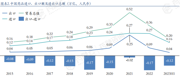 2015年至2022年,我国药品外贸额整体呈增长态势,复合增长率为12%,高于外贸进出口总值复合增长率,但我国药品外贸长期处于贸易逆差的形势之中,且有逐步扩大的趋势。但2021年由于新冠疫情,我国抗疫情类药品出口猛增,缩小贸易逆差至200亿元,2022年以后疫情影响逐步缩小,贸易逆差恢复至疫情前趋势。2023年上半年,药品贸易逆差达1200亿元,预计全年贸易逆差达2400亿元。