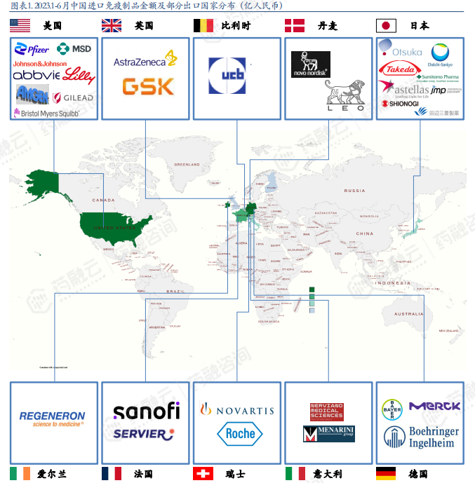 其中,免疫制品出口至中国金额前十国家中,欧洲国家占7成。排名靠前的有爱尔兰、瑞士、美国、德国、法国等。