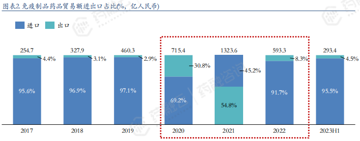 免疫制品药品贸易额进出口占比(%,亿人民币)
