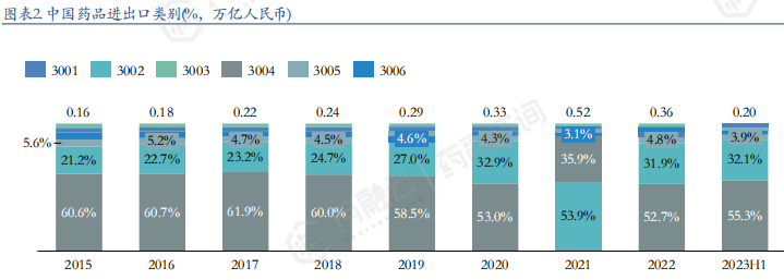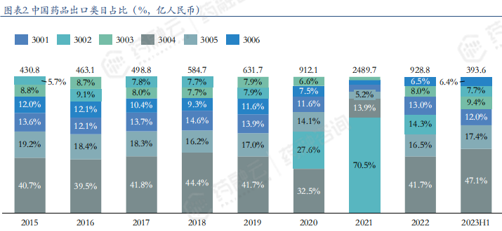 据海关统计数据显示,我国2015年到2023年上半年药品进出口总额占比最大的类目为3004,包含绝大部分的化学药和中成药。2021年由于新冠疫情影响,疫苗和免疫制品出口增加导致3002类目占比暴涨。