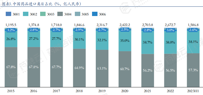 尽管3004类目长期占据我国药品进出口第一位,但占比有逐年下降的趋势,从2015年的60.6%下降至2022年的53%。相反的,3002类目产品逐年上升,从2015年的21%上升至2022年的32%,这可能和近十年医药领域生物制品行业的迅猛发展相关。