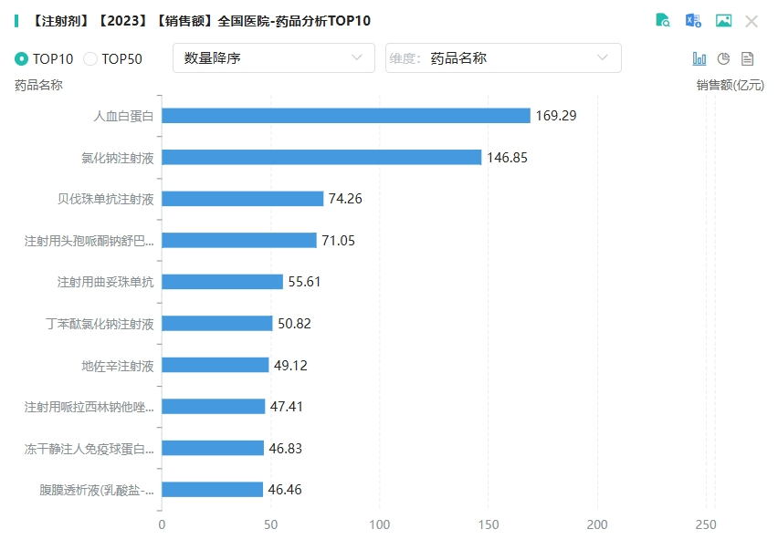 在2023年的全国医院注射剂(含化药/生物药/中成药)市场,化学药在其中占据了显著的主导地位。销售额TOP10榜单中,超140亿元的有人血白蛋白、氯化钠注射液2个品种。其余药物的销售额均超过46亿元,充分展现了市场的繁荣与活力。