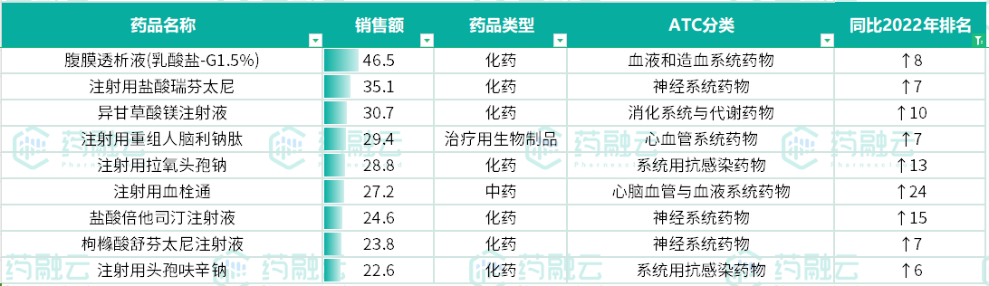 同时,腹膜透析液(乳酸盐-G1.5%)、注射用盐酸瑞芬太尼、异甘草酸镁注射液、注射用重组人脑利钠肽、注射用拉氧头孢钠等药品,在2023年全国医院注射剂市场的销售排名也均实现了显著的提升,展现了强大的市场竞争力。
