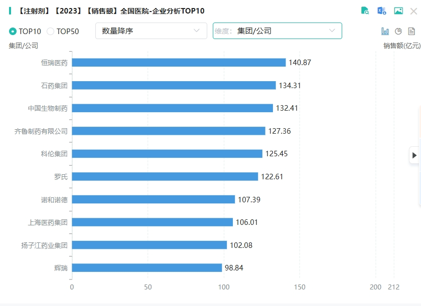 据药融云数据库统计,注射剂在2023年全国院内市场规模超5000亿元,其中化学药品种占据主要份额。排名50销售品种迎变局,刷新2022年销售记录的品种就多达12款,销售额均20亿品种。生产企业TOP10榜单中,本土药企占据7席,分别为江苏恒瑞、石药集团、中国生物制药、齐鲁制药、科伦集团、上海医药集团、扬子江药业。