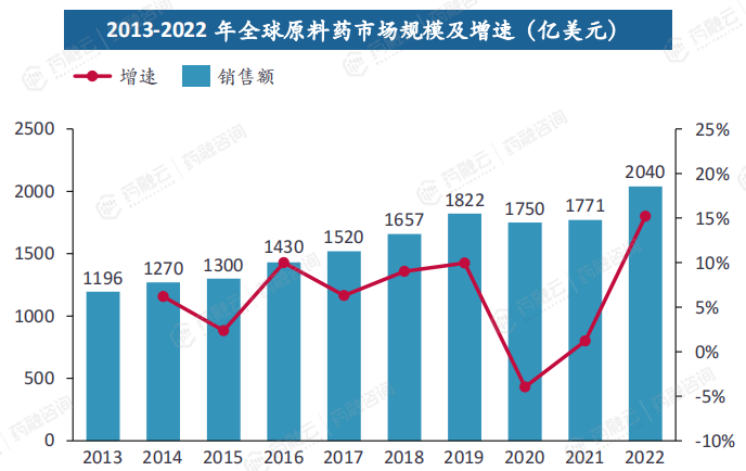 从全球范围来看,原料药市场在经历了2020年新冠疫情的冲击后逐渐恢复增长。全球原料药市场规模在2020年受新冠肺炎疫情影响与2019年相比有所下滑,从1822亿美元降至1750亿美元,下降3.95%;但很快,市场从2021年开始便恢复了增长,2022年全球原料药市场规模达到2040亿美元。