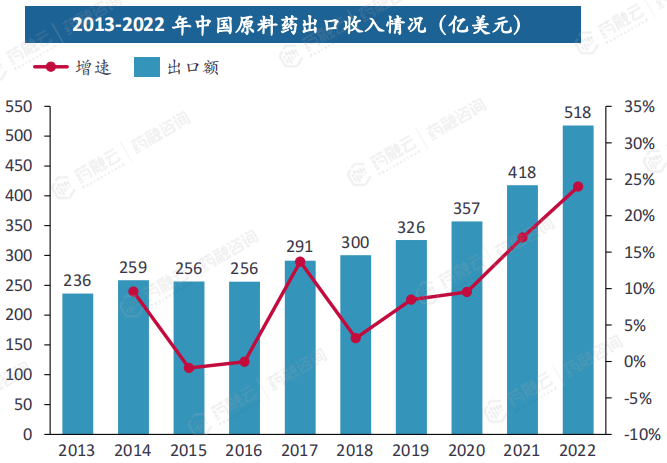 中国原料药出口收入在2013-2022年10年间除2015年、2016年两年出口收入略有降低外,基本保持增长趋势,尤其是疫情爆发后,中国原料药出口收入增长明显,2019-2022年4年出口收入增速依次为8.47%、9.53%、17.00%、23.99%。
