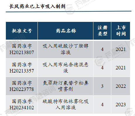 目前,长风药业已上市4款吸入制剂,包括吸入用硫酸沙丁胺醇溶液、吸入用布地奈德混悬液、硫酸特布他林雾化吸入用溶液、氮卓斯汀氟替卡松鼻喷雾剂。