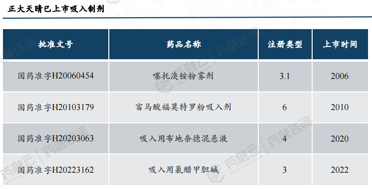 正大天晴吸入制剂已上市4个品种,包括噻托溴铵粉雾剂、富马酸福莫特罗粉吸入剂、吸入用布地奈德混悬液及吸入用氯醋甲胆碱。
