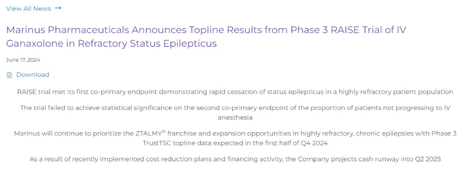 6月17日,Marinus Pharmaceuticals宣布了3期双盲、随机、安慰剂对照RAISE试验(NCT04391569)的初步结果仅达到了两个关键终点中的一个。公司将继续分析RAISE的全部数据集,并计划与美国FDA接触,讨论静脉注射加奈索隆治疗RSE的潜在发展方向。