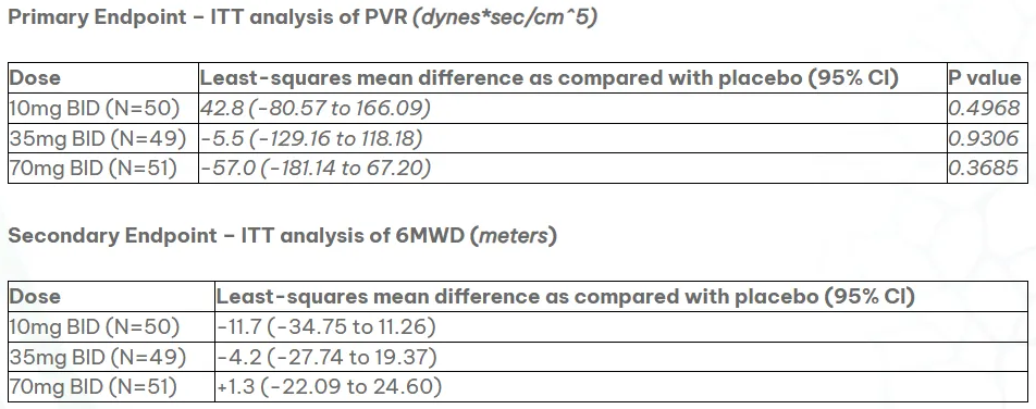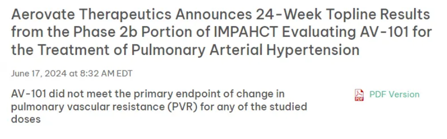 结果表明,虽然AV-101在所有剂量组的耐受性都很好,但与安慰剂相比,研究的任何剂量都没有达到改善PVR的主要终点,也没有在六分钟步行距离(6MWD)变化的次要终点上显示出有意义的改善。在其他几个次要终点上也未能显示出有意义的改善。基于这些结果,Aerovate与独立研究咨询委员会达成一致,停止了IMPAHCT试验III期部分的入组和长期扩展研究。