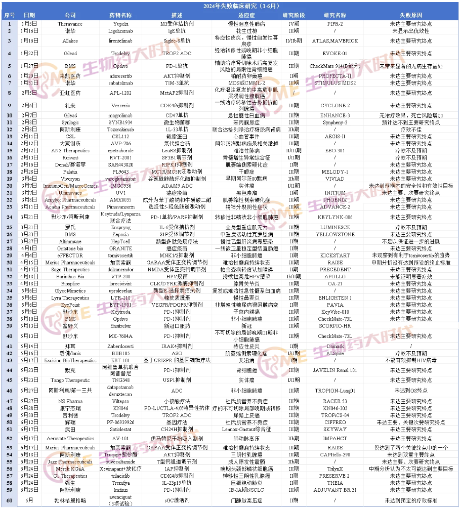 创新药物的研发总是充满失败的可能,据不完全统计,2024年上半年共有63项临床研究宣告失败,其中6月份有13项,涉及知名药企辉瑞、武田、阿斯利康等。这些研究中的大部分折戟在III期临床,新药研发有其不可违背的客观规律,如果前期基础研究不够扎实,则后期试验推进将困难重重。失败临床研究汇总如下: