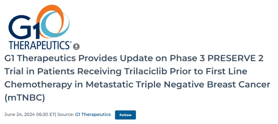 6月24日,G1 Therapeutics公布了其3期PRESERVE 2试验的最终OS分析结果,该试验评估了CDK4/6抑制剂曲拉西利(trilaciclib)在转移性三阴性乳腺癌(TNBC)患者化疗(吉西他滨和卡铂;GCb)前给药的疗效和安全性,该研究未显示出具有统计学意义的治疗效果。