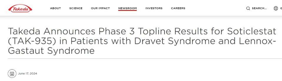 2024年6月17日,武田公布了其同类首创的强效选择性胆固醇24-羟化酶 (CH24H) 抑制剂Soticlestat (TAK-935)的SKYLINE和SKYWAY研究的顶线数据。